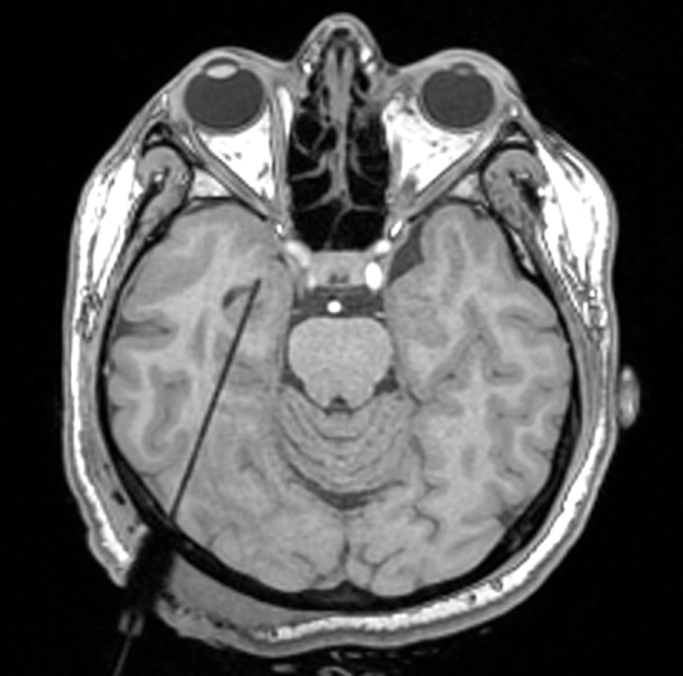 Rycina 2 Śródoperacyjne badanie rezonansu magnetycznego mózgu płaszczyzna poprzeczna uwidoczniające laser wprowadzony do ciała migdałowatego i hipokampa po stronie prawej.